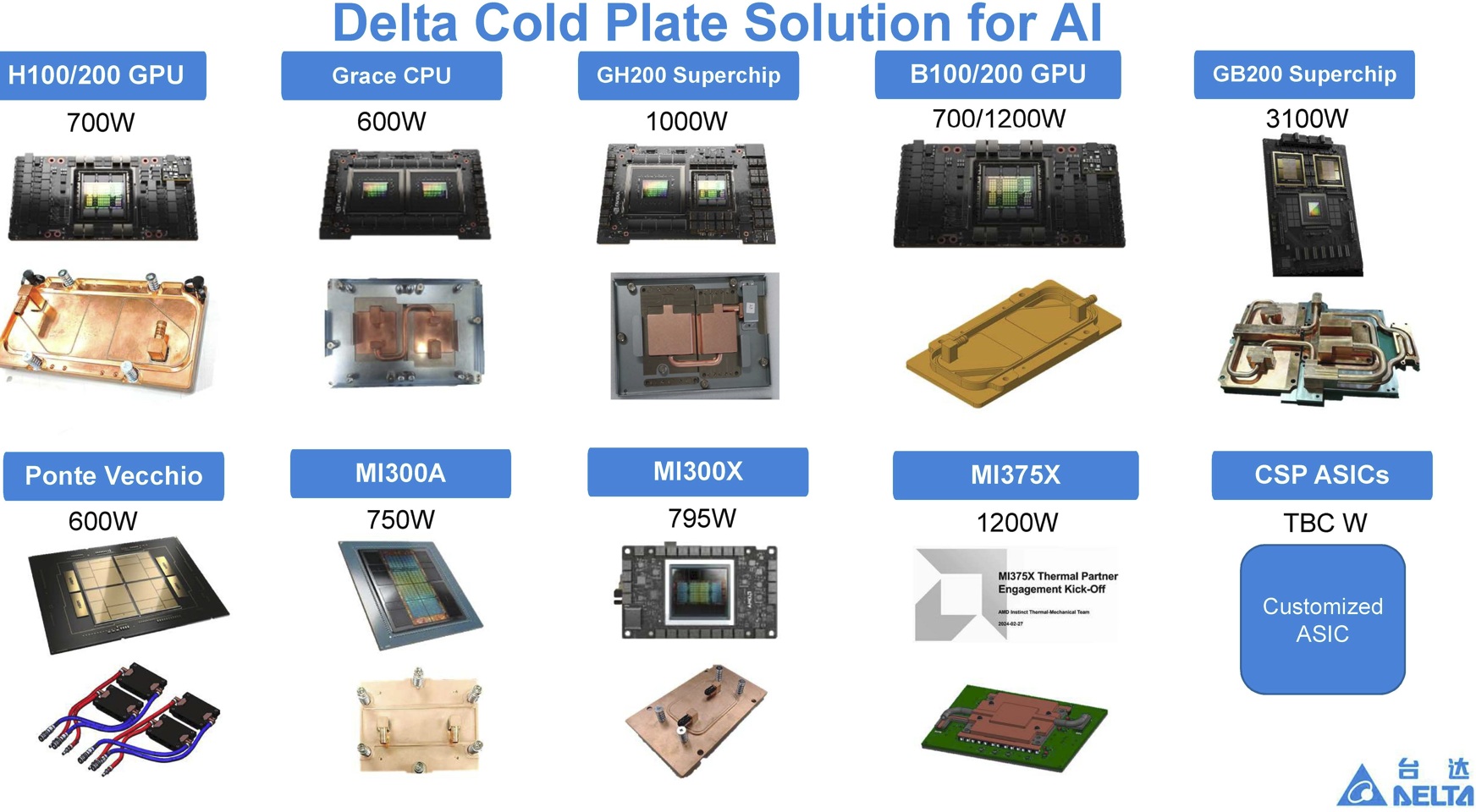 台达提供多种水冷板方案,适用于系统的功率元件,如CPU、GPU、DIMMs和晶片。